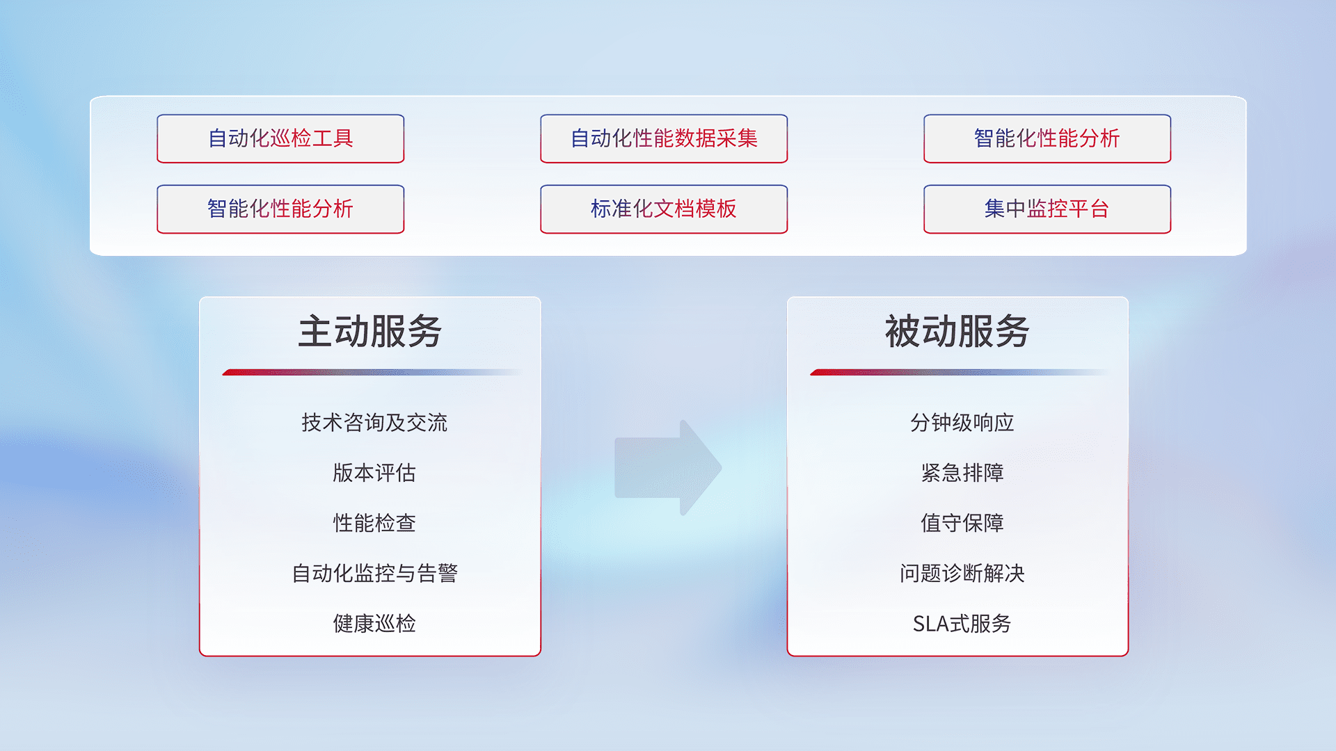 智能化工具和标准化文档,,保障服务质量,,,,提供主动服务(包含技术咨询、、、版本评估、、性能检查、、自动化监控与告警、、、、健康巡检)和被动服务包含(分钟级响应、、紧急排障、、、、值守保障、、、问题诊断解决、、SLA服务)。。